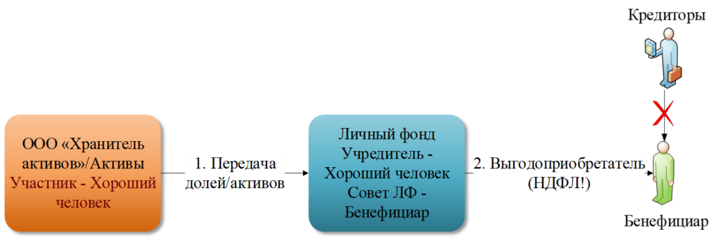 Такая конструкция требует особой проработки устава и условий управления личным фондом, чтобы выгодоприобретателей нельзя было сменить по решению учредителя, между тем, у нее есть существенное преимущество перед другими конструкциями: по долгам выгодоприобретателя нельзя наложить взыскание на имущество личного фонда. С другой стороны, выгодоприобретатели не смогут получать от личного фонда деньги или имущество без НДФЛ при жизни учредителя, если они не его близкие родственники. Но и над этой проблемой можно подумать.