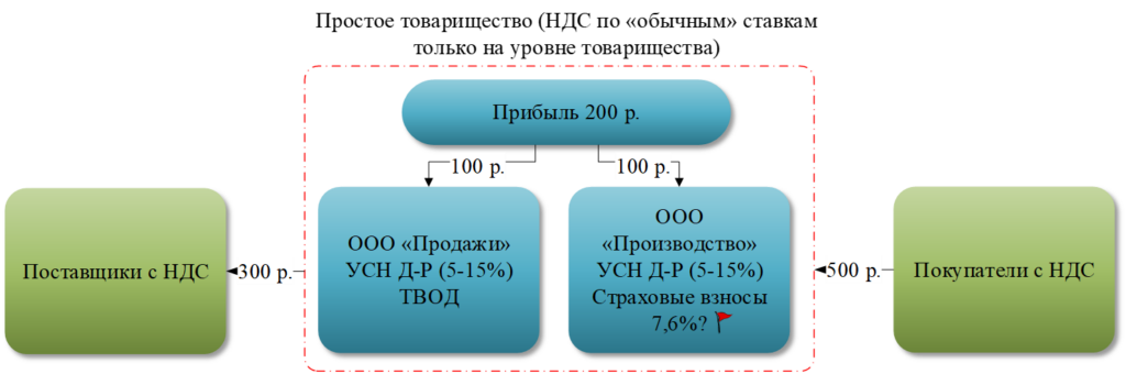 Простое товарищество может давать и оптимизационный эффект, если товарищи применяют УСН: товарищам распределяется только прибыль от совместной деятельности и облагается налогом по их системе налогообложения, что позволяет как сохранить специальный налоговый режим по критерию размера дохода, так и облагать доход по УСН, а не по ставкам налога на прибыль. При этом товарищи могут применять только ОСН или УСН с базой доходы минус расходы.