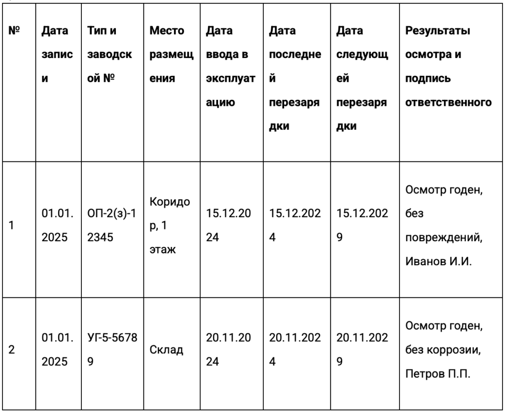 - Фиксация осмотров и перезарядок. После каждого квартального и годового контроля указывайте дату, результаты проверки и подпись ответственного.